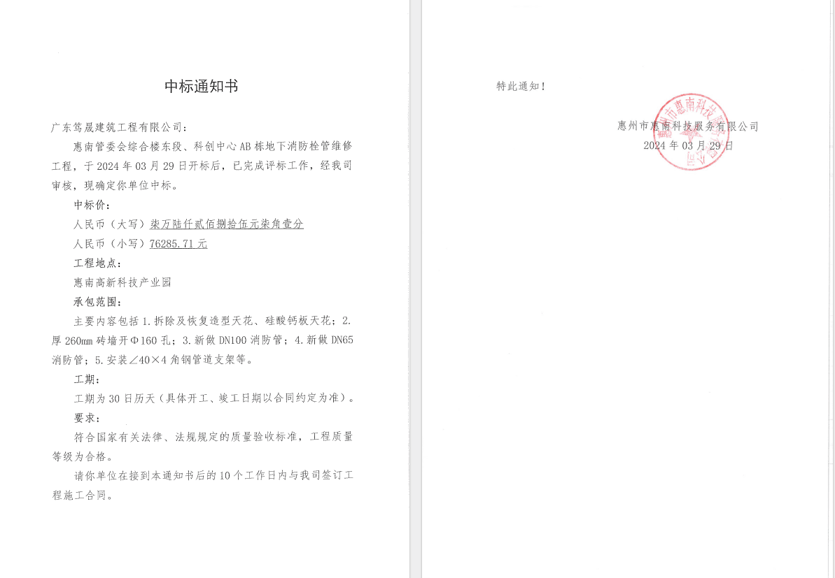 【中標(biāo)通知】惠南管委會(huì)綜合樓東段、科創(chuàng)中心AB棟地下消防栓管維修工程