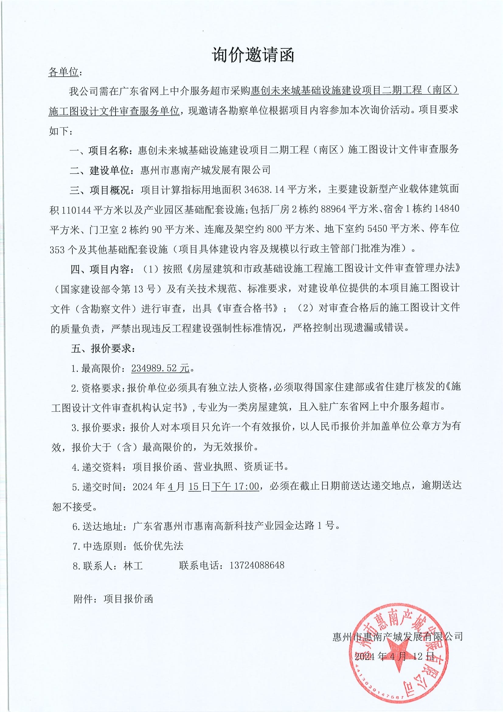 惠創(chuàng)未來城基礎(chǔ)設(shè)施建設(shè)項(xiàng)目二期工程(南區(qū))施工圖設(shè)計(jì)文件審查服務(wù)詢價(jià)邀請(qǐng)函