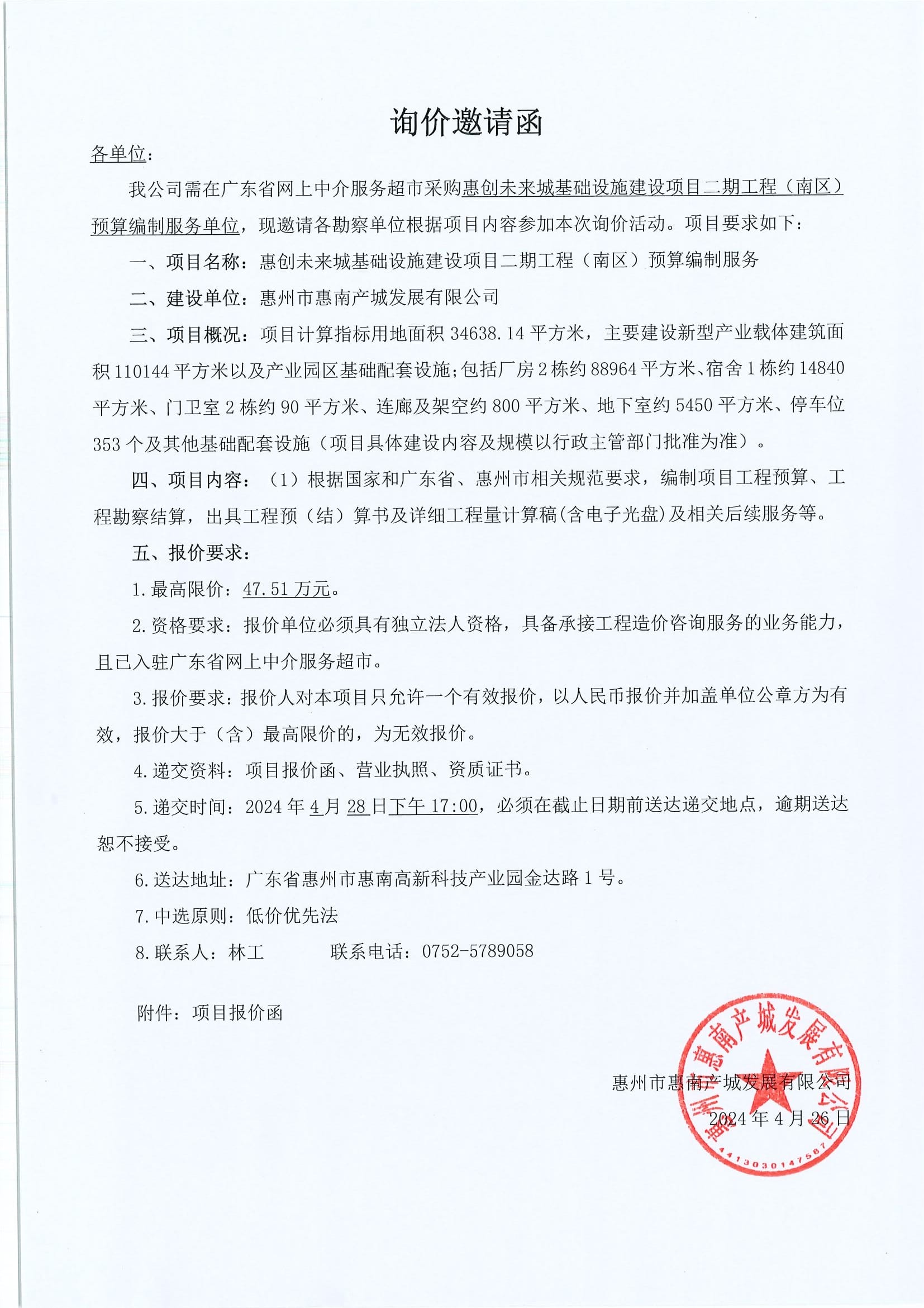 惠創(chuàng)未來城基礎(chǔ)設(shè)施建設(shè)項目二期工程(南區(qū))預(yù)算編制服務(wù)詢價邀請函