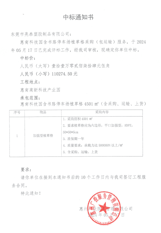 【中標通知】惠南科技園含書路停車場植草格采購(包運輸)服務