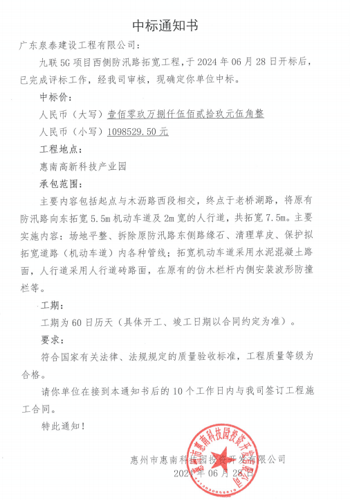 【中標通知】九聯(lián)5G項目西側(cè)防汛路拓寬工程