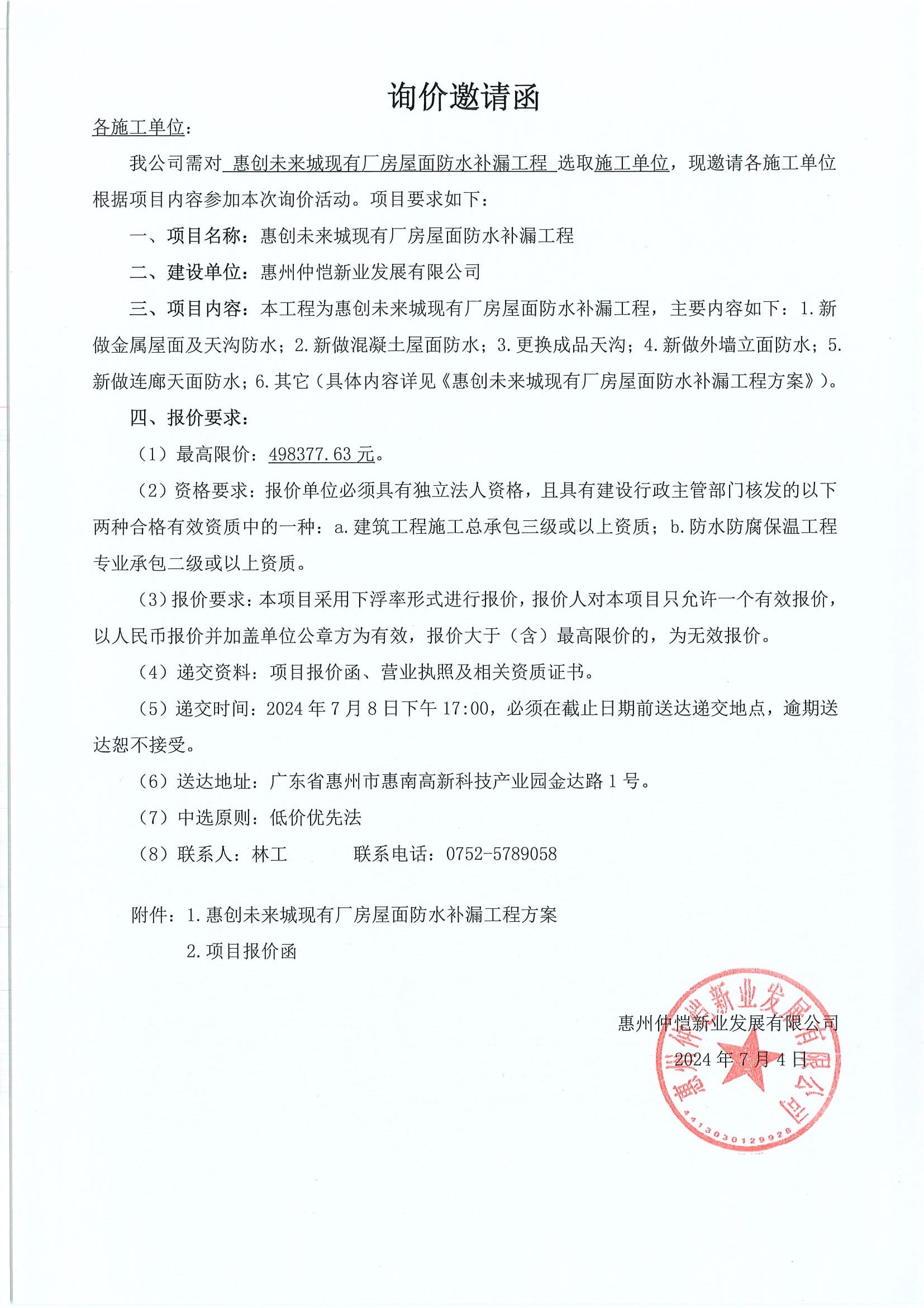 惠創(chuàng)未來(lái)城現(xiàn)有廠(chǎng)房屋面防水補(bǔ)漏工程詢(xún)價(jià)邀請(qǐng)函