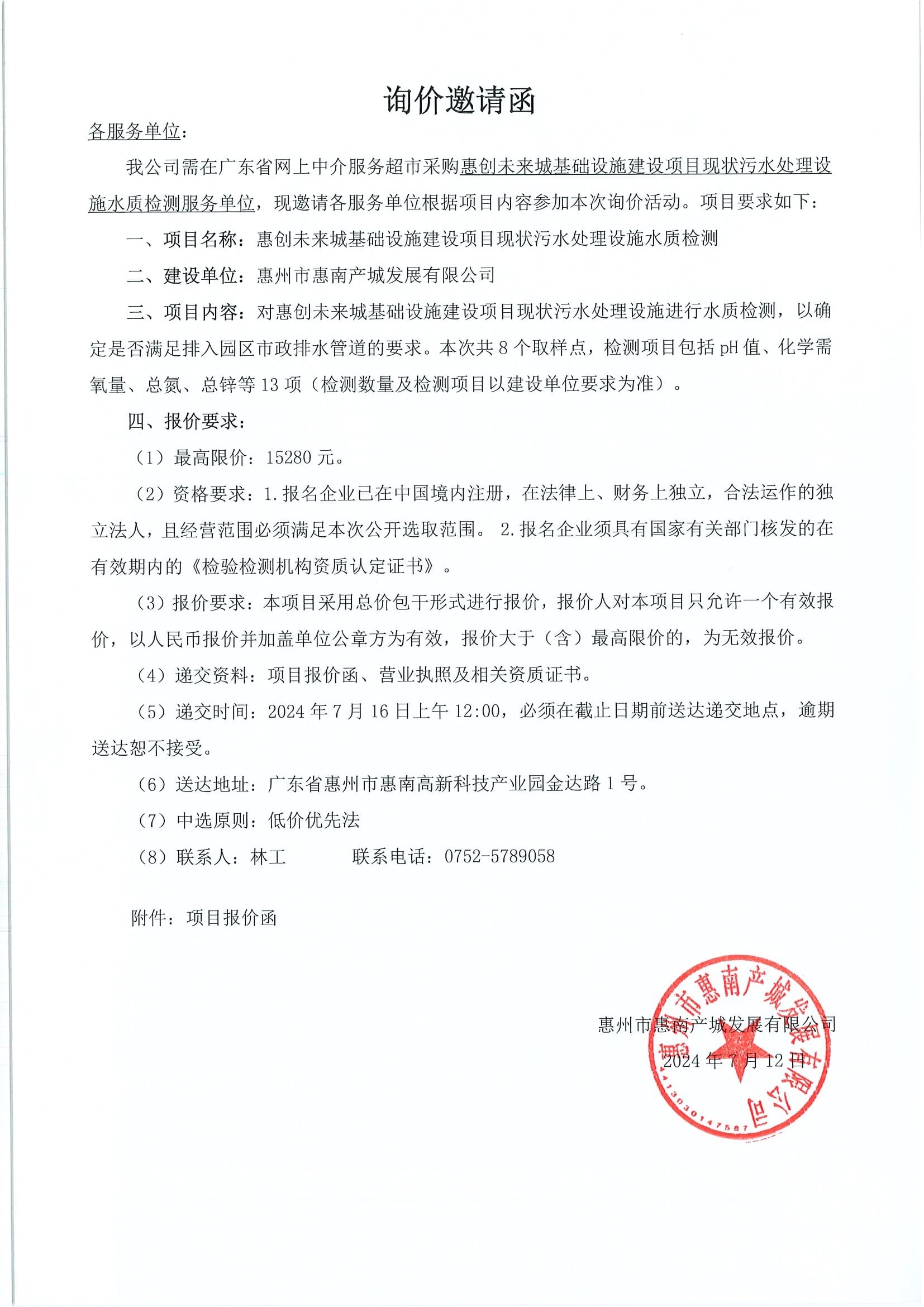 惠創(chuàng)未來城基礎(chǔ)設(shè)施建設(shè)項目現(xiàn)狀污水處理設(shè)施水質(zhì)檢測詢價邀請函