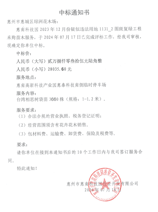【中標通知】惠南科技園2023年12月份疑似違法用地1131_2圖斑復綠工程采購苗木服務(wù)