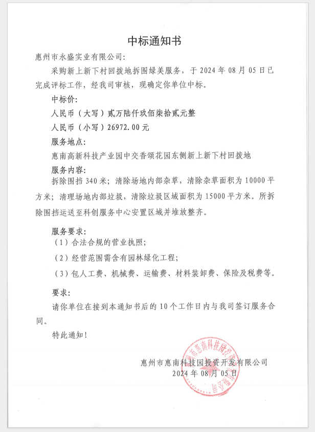 【中標通知】采購新上新下村回撥地拆圍綠美服務