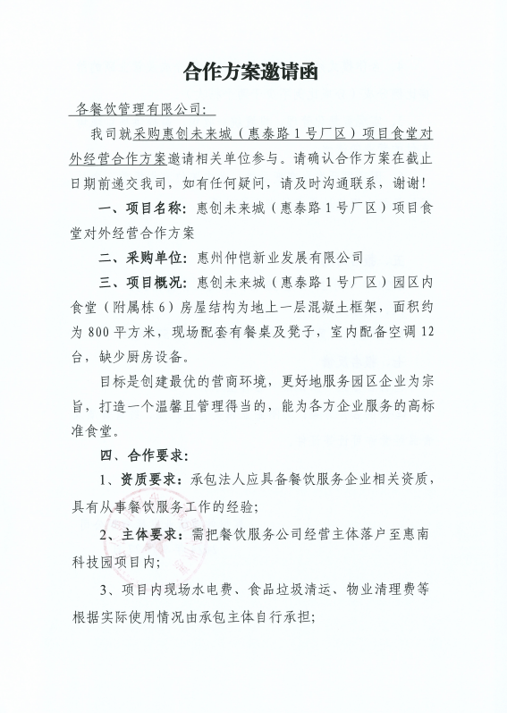 采購惠創(chuàng)未來城(惠泰路1號廠區(qū))項目食堂對外經(jīng)營合作方案