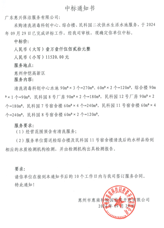 【中標(biāo)通知】采購(gòu)清洗消毒科創(chuàng)中心、綜合樓、民科園二次供水生活水池服務(wù)