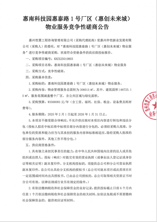 惠南科技園惠泰路1號(hào)廠區(qū)(惠創(chuàng)未來(lái)城) 物業(yè)服務(wù)競(jìng)爭(zhēng)性磋商公告