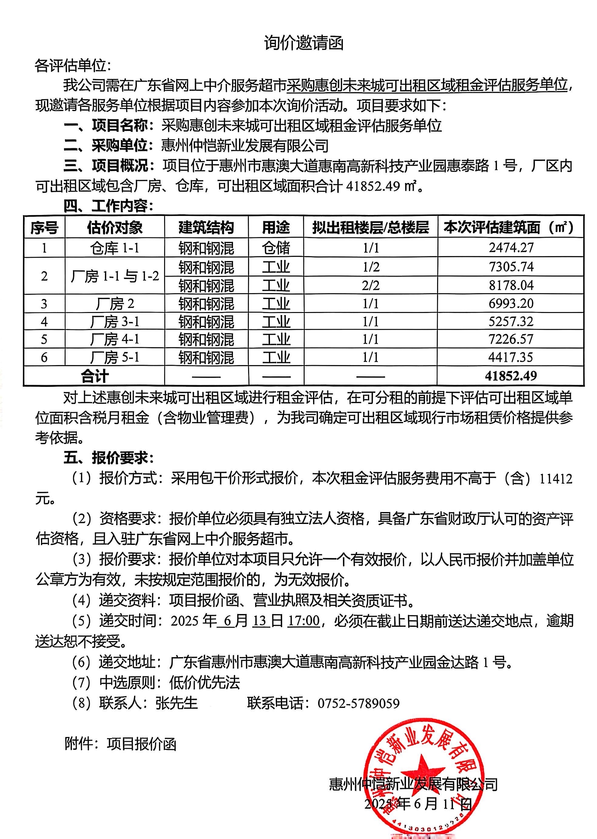 【詢價邀請函】采購惠創(chuàng)未來城可出租區(qū)域租金評估服務(wù)單位