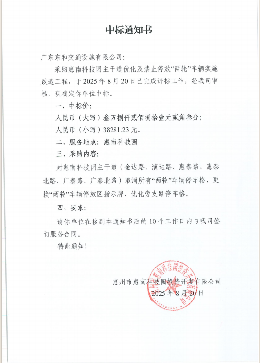【中標(biāo)通知】采購(gòu)惠南科技園主干道優(yōu)化及禁止停放“兩輪”車輛實(shí)施改造工程
