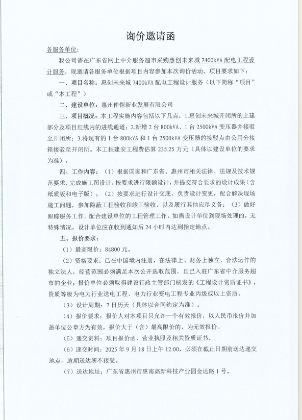 【詢價邀請函】惠創(chuàng)未來城7400kVA配電工程設(shè)計服務(wù)