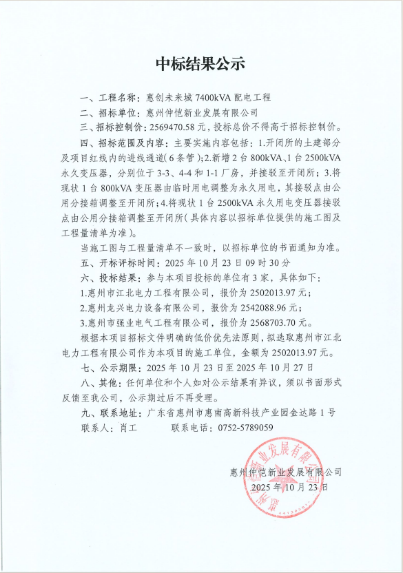 【中標(biāo)結(jié)果公示】惠創(chuàng)未來(lái)城7400kVA配電工程