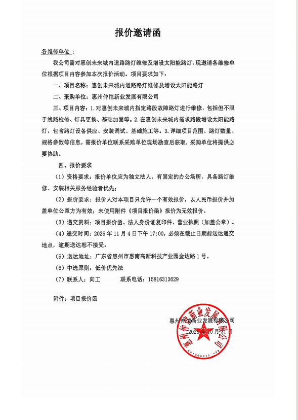 【報(bào)價(jià)邀請(qǐng)函】惠創(chuàng)未來城內(nèi)道路路燈維修及增設(shè)太陽能路燈