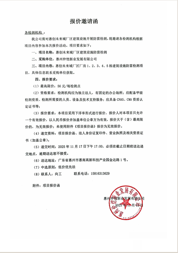 【報價邀請函】惠創(chuàng)未來城廠區(qū)廠房1、2、3、4、5棟建筑設(shè)施防雷檢測項目