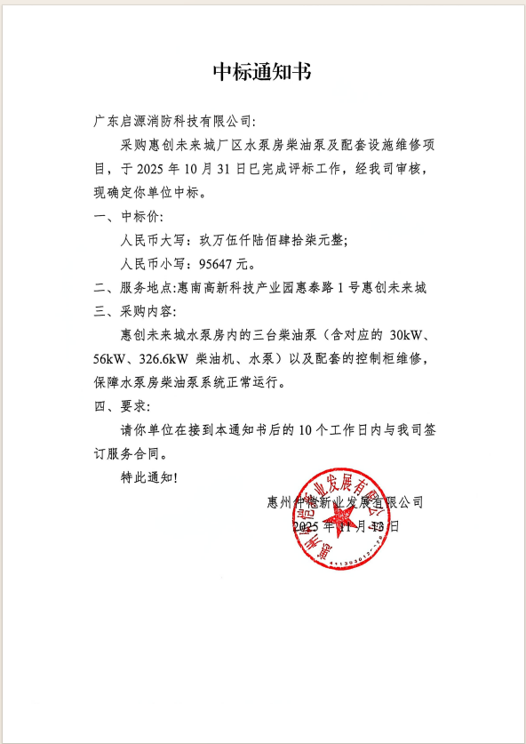 【中標通知書】惠創(chuàng)未來城廠區(qū)水泵房柴油泵及配套設(shè)施維修項目
