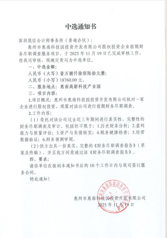 【中選通知】惠州市惠南科技園投資開發(fā)有限公司股權投資企業(yè)前期財務盡職調(diào)查服務項目
