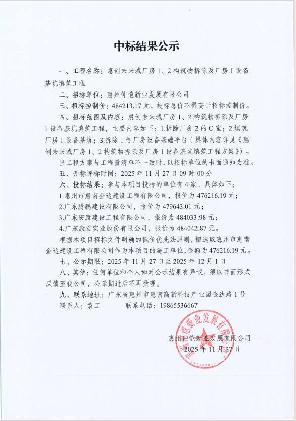【中標(biāo)結(jié)果公示】惠創(chuàng)未來城廠房 1、2構(gòu)筑物拆除及廠房1設(shè)備基坑填筑工程