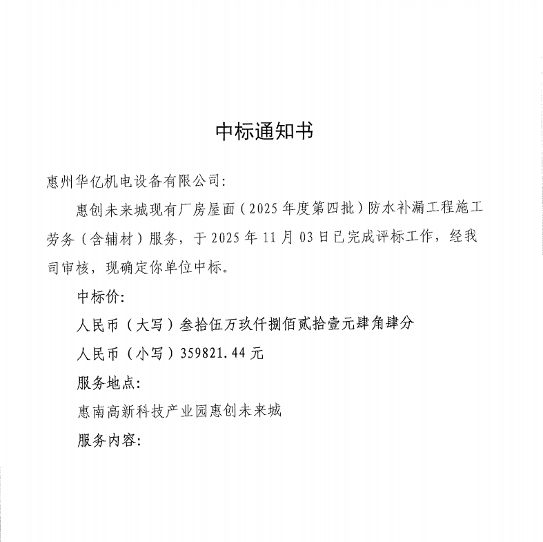 【中標通知】惠創(chuàng)未來城現(xiàn)有廠房屋面(2025年度第四批)防水補漏工程施工勞務(含輔材)服務