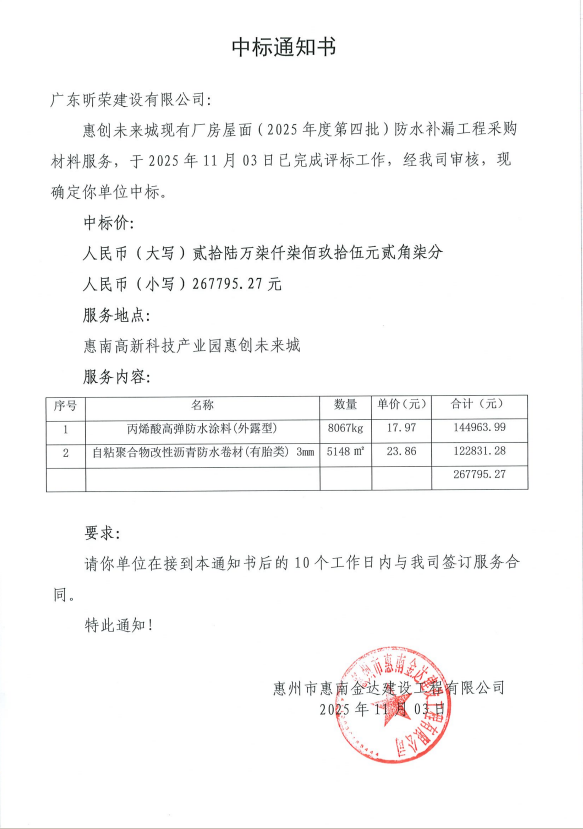 【中標(biāo)通知】惠創(chuàng)未來城現(xiàn)有廠房屋面(2025年度第四批)防水補(bǔ)漏工程采購材料服務(wù)