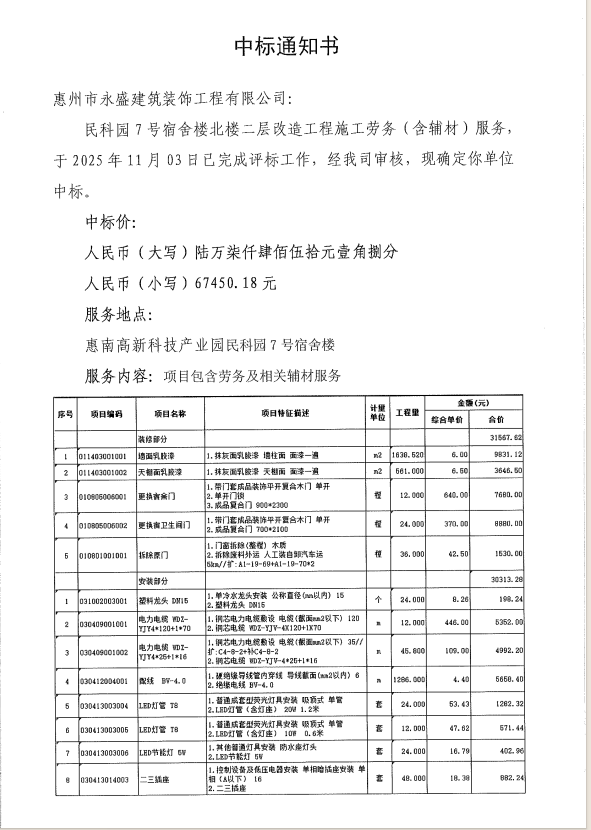 【中標通知】民科園7號宿舍樓北樓二層改造工程施工勞務(wù)(含輔材)服務(wù)