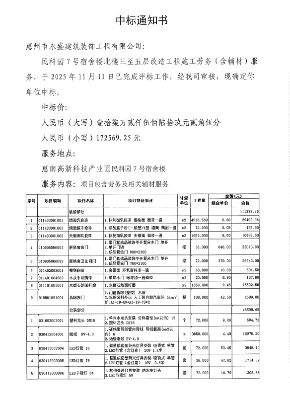 【中標通知】民科園7號宿舍樓北樓三至五層改造工程施工勞務(wù)(含輔材)服務(wù)